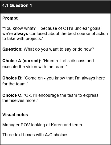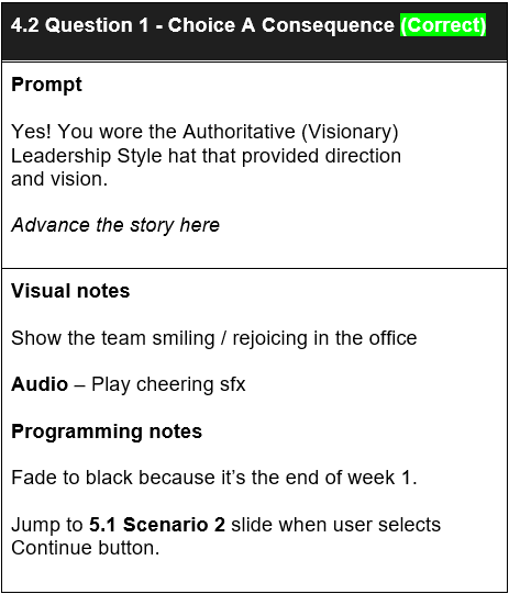 After identifying the problem, I considered a variety of solutions and ultimately proposed a scenario-based e-learning experience. One of the key benefits is that managers can practice applying various leadership styles in a risk-free environment, using realistic scenarios tailored to the needs of both teams and the business. This approach is also grounded in research. Effective leaders are “skilled at several [leadership] styles and have the flexibility to switch between styles as the circumstances dictate” (Goleman, 2000).