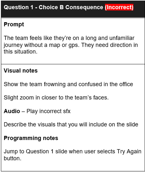 Incorrect choices produce a sound effect, an explanation, and a “Try Again” option. A mentor character, Mikado, and a job aid offer guidance as needed throughout the experience. Immersion is enhanced through sound effects and responsive team facial expressions. Below are the edited storyboard screenshots.