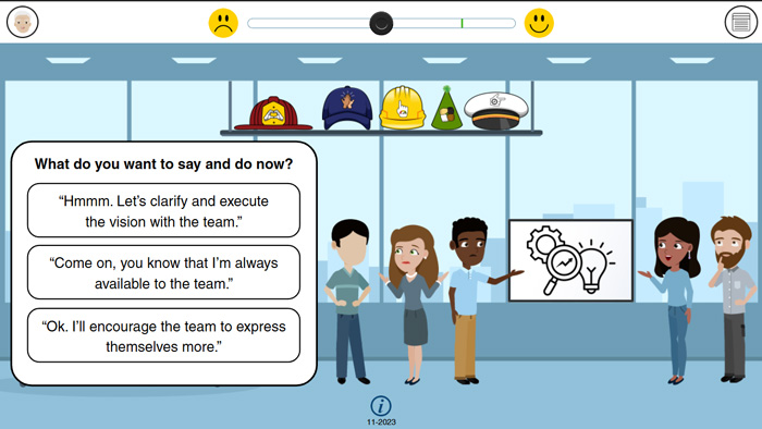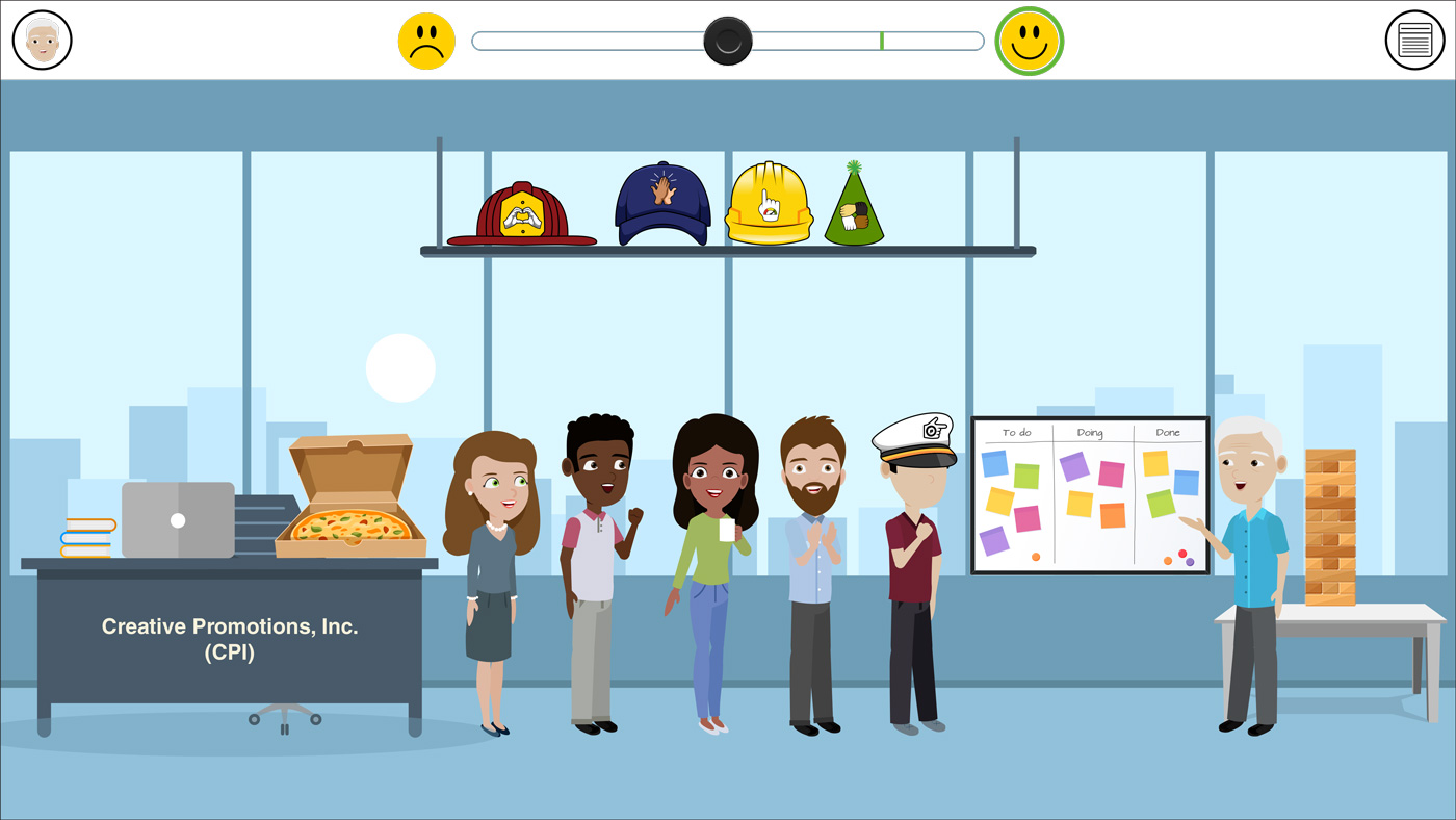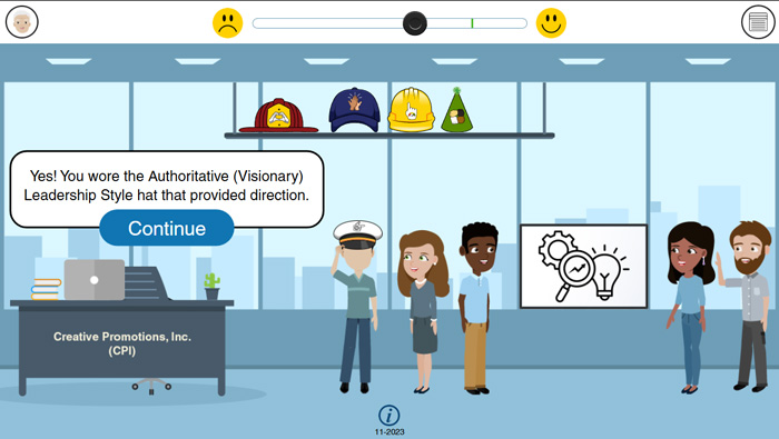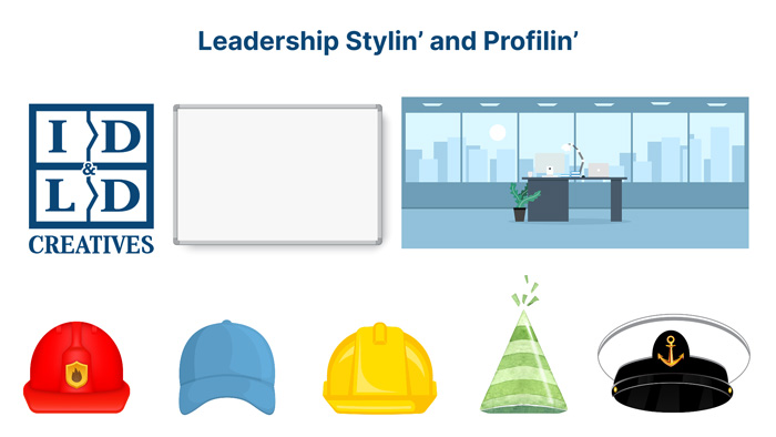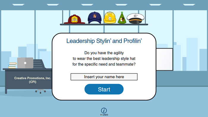 Participants practice leadership agility by choosing from one correct and two incorrect options in each scenario. Five different hats represent leadership styles, but their meanings are not revealed. A correct choice places the matching hat on the participant’s head with a team cheer — inspiring the title Leadership Stylin’ and Profilin’.