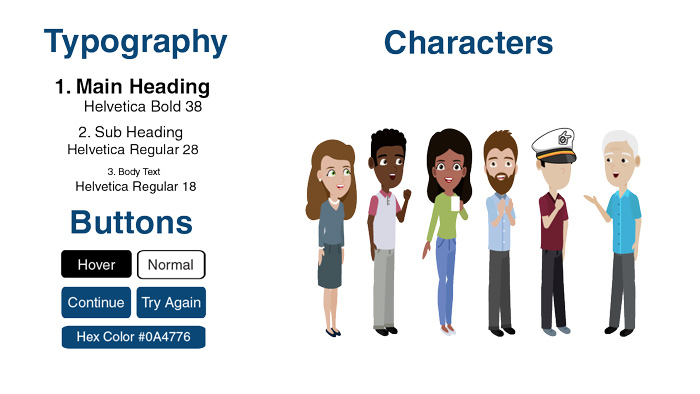 Finding a diverse character set from one source was challenging. Each scenario required different poses and facial expressions. I eventually selected five representative team members and one experienced mentor. The manager character is faceless to allow users to see themselves in the role. Clothing and colors changed with each scenario.